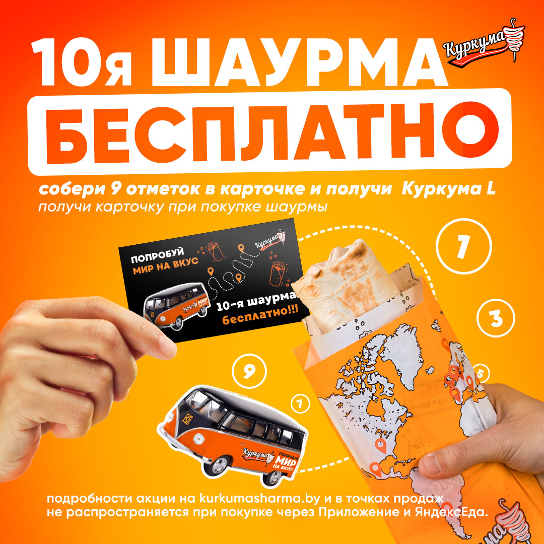 Сеть шаурмы «Куркума» возобновляет программу лояльности для наших постоянных гостей. Теперь ваша любовь к любимой и вкусной шаурме будет вознаграждена по-настоящему! Мы дарим вам возможность получать бесплатную шаурму за ваши частые покупки.